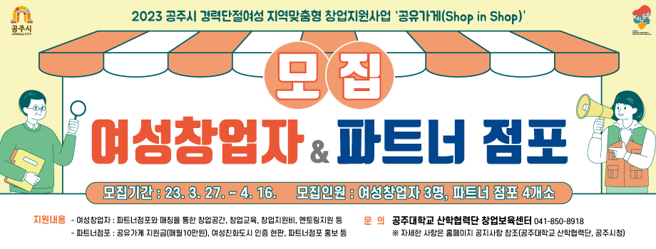 2023 공주시 경력단절여성 지역맞춤형 창업지원 '공유가게' 여성창업자와 파트너 점포를 아래와 같이 모집합니다.