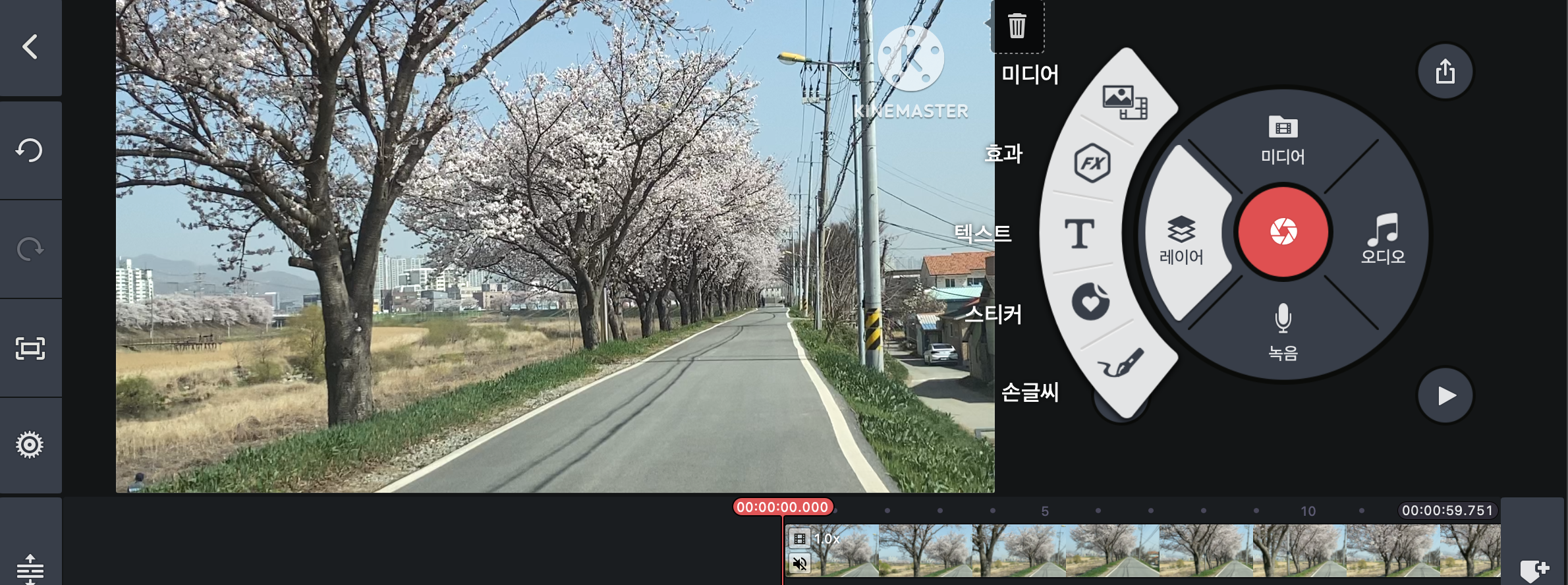 우선 오른쪽 동그란 툴박스에서 미디어 아이콘을 눌러 해당 영상을 타임라인으로 불러옵니다.