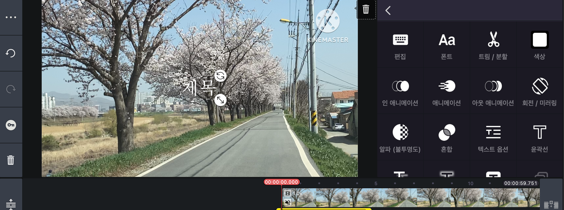 아래 이미지에서 보이는 것처럼 영상의 한가운데에 "제목"이라는 글씨가 보이고 점선으로 선택된 것이 표시됩니다. 점선으로 표시되어 있는 동안에는 손가락으로 터치하여 위치를 옮길 수도 있습니다. 손가락 두 개를 사용하거나 대각선으로 표시된 아래위 양방향을 표시하는 화살표를 손가락 하나로 끌어당기면 크기를 조절할 수 있습니다. 회전하는 모양의 화살표는 글씨를 원하는 각도만큼 회전시킬 수 있다는 뜻입니다.