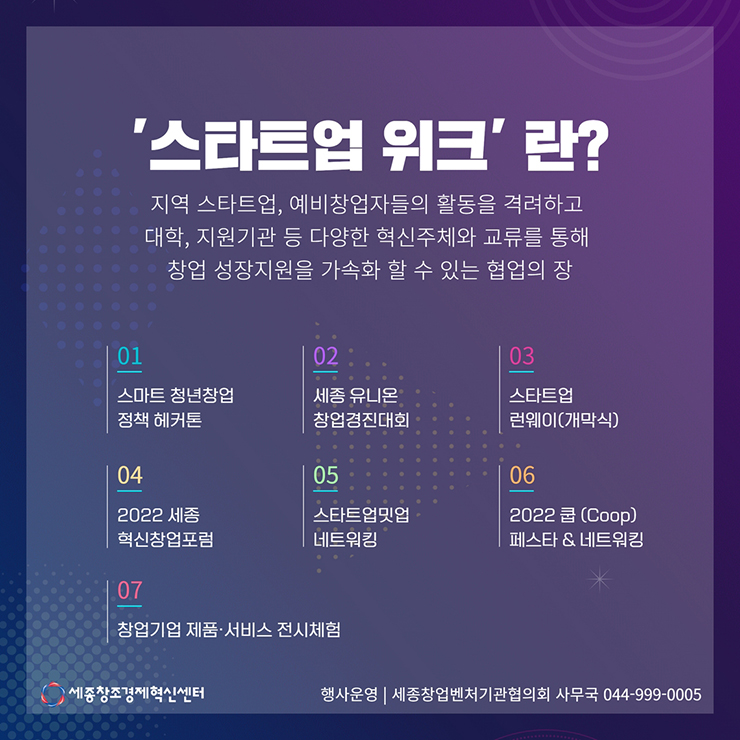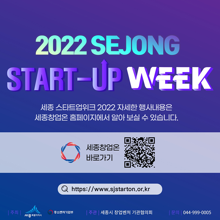 미래 혁신성장을 이끌 세종 스타트업 위크 2022에 지역 스타트업, 예비창업자 및 관심 있는 모든 분들을 초대합니다.