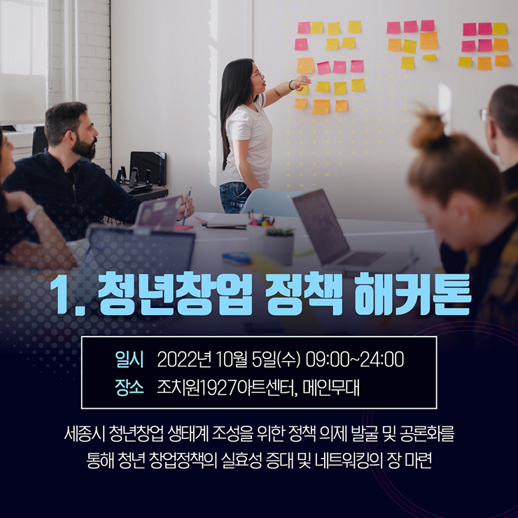 세종시 청년창업 생태계 조성을 위한 정책 의제 발굴 및 공론화를 통해 청년 창업정책의 실효성 증대 및 네트워킹의 장 마련