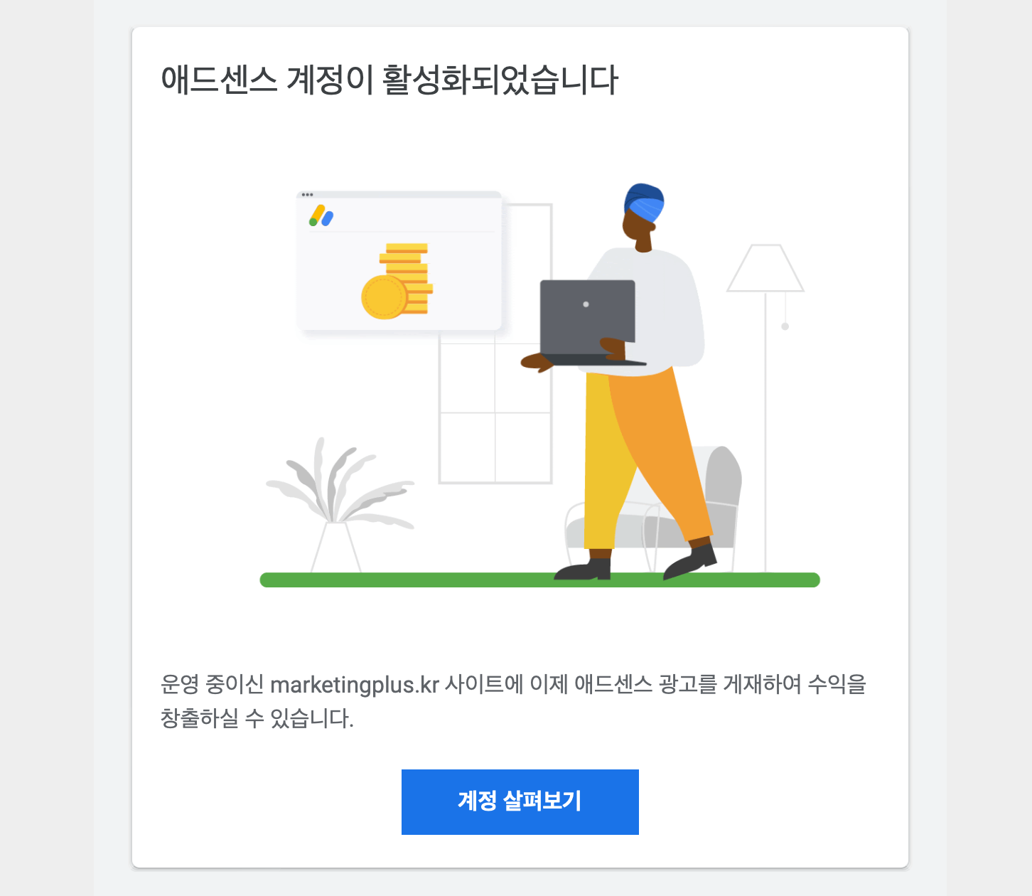 그리고 2주 정도 지났습니다. 9월 18일(일요일) 오후 구글로부터 애드센스 계정이 활성화되었다는 메일을 받게 되었습니다. 정말 기뻤습니다. 의외로 광고 클릭 수입도 많이 나오고 방문자도 많았습니다. 구글에 노출도 잘 되는 것 같았습니다.